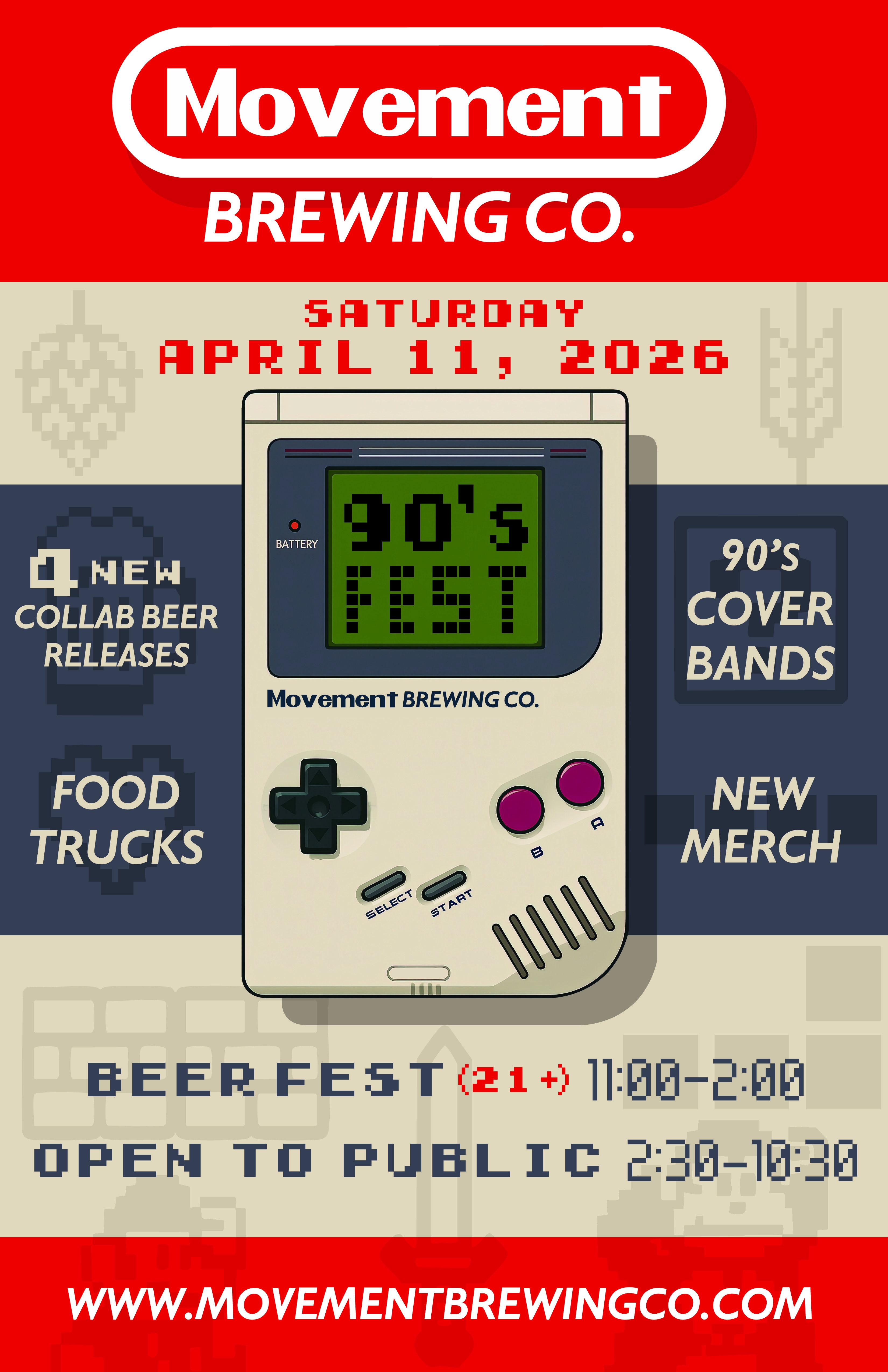 Grab your neon windbreaker and head to Movement Brewery's Annual 90's Fest on Saturday, April 11th! Tickets go live soon so keep an eye out!