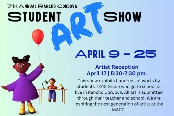 Head to the MACC for the 7th Annual Student Art Show from April 9th-25th to enjoy a beautiful showcase of youth artwork in Rancho Cordova!